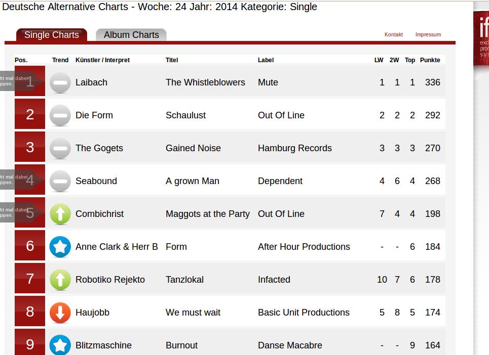Auf dem Wave Gotik Treffen war die Single ja in diversen Playlist ein Garant für volle Floors: Blitzmaschine sind soeben mit ihrer knackigen und großzügigen EBM Double Single Burnout/Uncontrollable in die Single Charts der DAC auf Platz 9 eingestiegen. Wir freuen uns und warten auf kommende Woche.