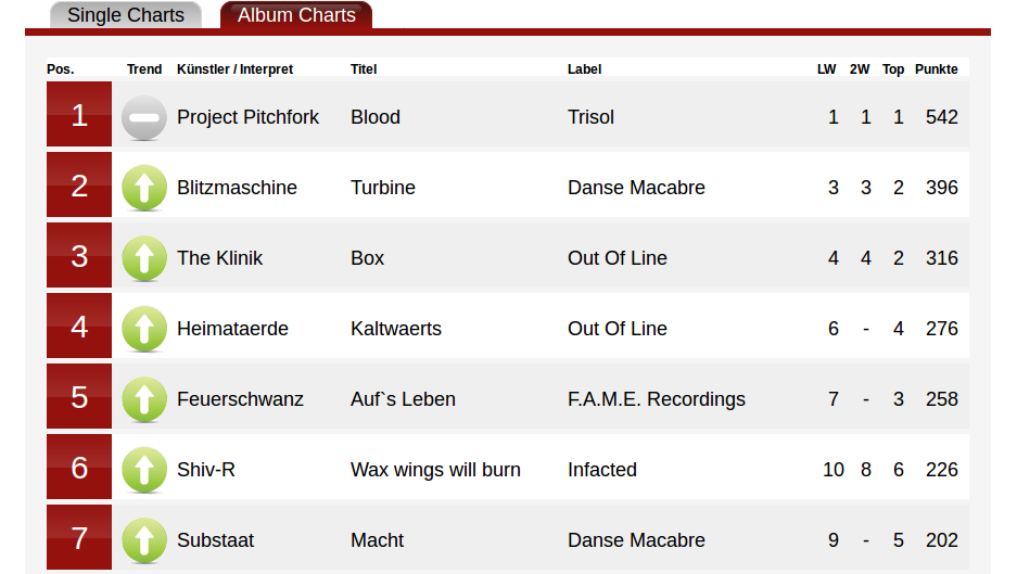 In den Albencharts tummeln sich auch Platz 2: Blitzmaschine – Turbine und auf Platz 7: Substaat – Macht.
