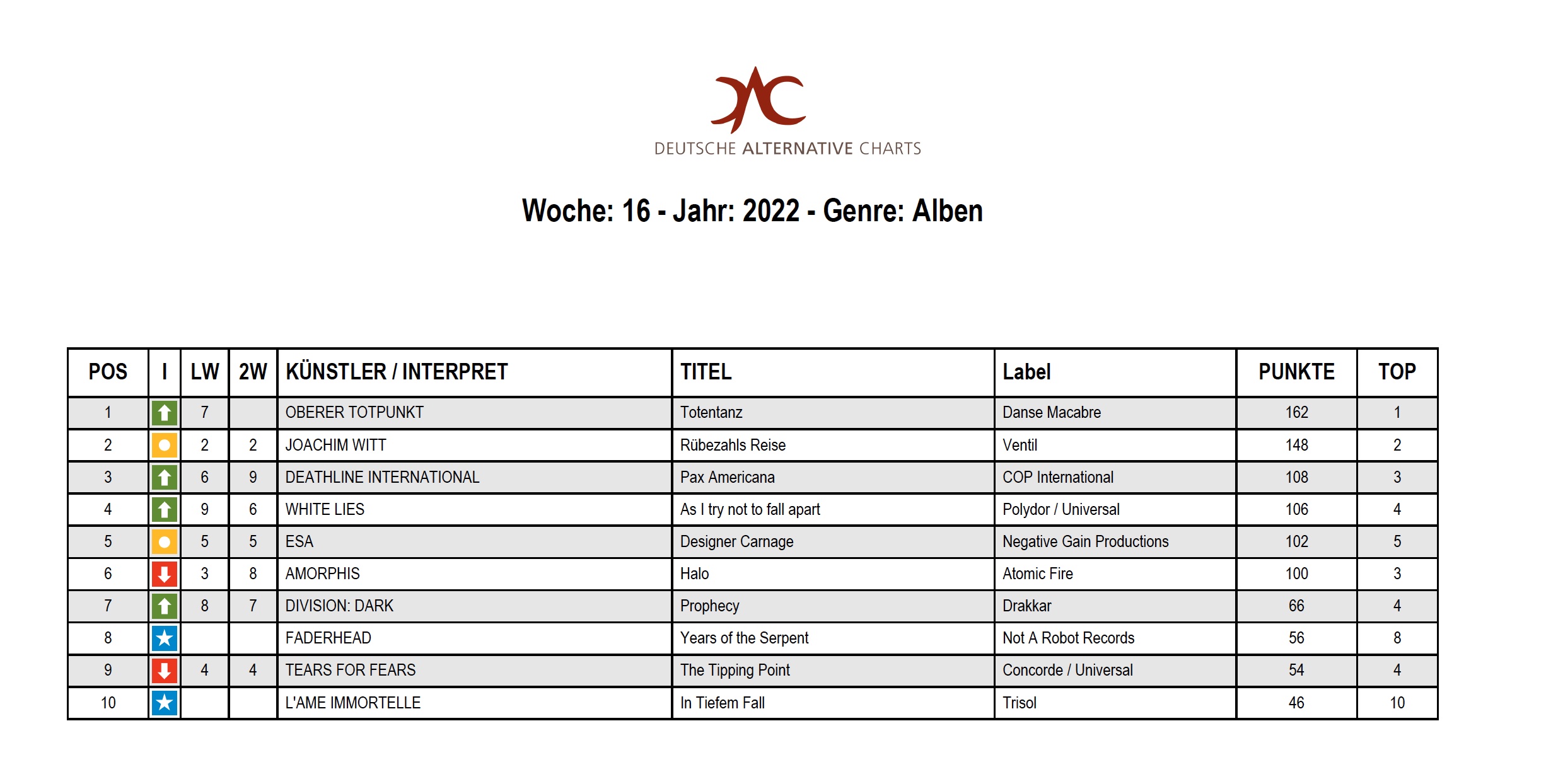 Oberer Totpunkt – Polepostion in den DAC Tweet Oberer Totpunkt erreichen mit ihrem neuen Album „Totentanz“ die Spitze der deutschen Alternativcharts. Wir freuen uns riesig und gratulieren herzlichst. 18 April 2022 label News Die Kommentare sind geschlossen.