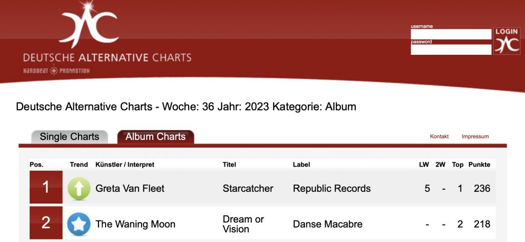 The Waning Moon entern mit ihrem phänomenalen Album „A Dream Or A Vision“ direkt die Deutschen Alternative Charts of Platz 2. Wir gratulieren und freuen uns über den Erfolg der Gothrocker aus den USA und Südamerika.